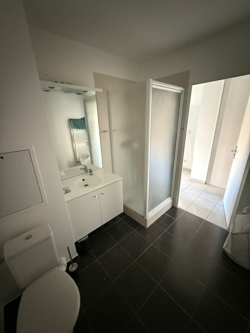 Salle d’eau privative : cabine de douche, meuble vasque avec miroir, WC et espace optimisé pour plus de confort.