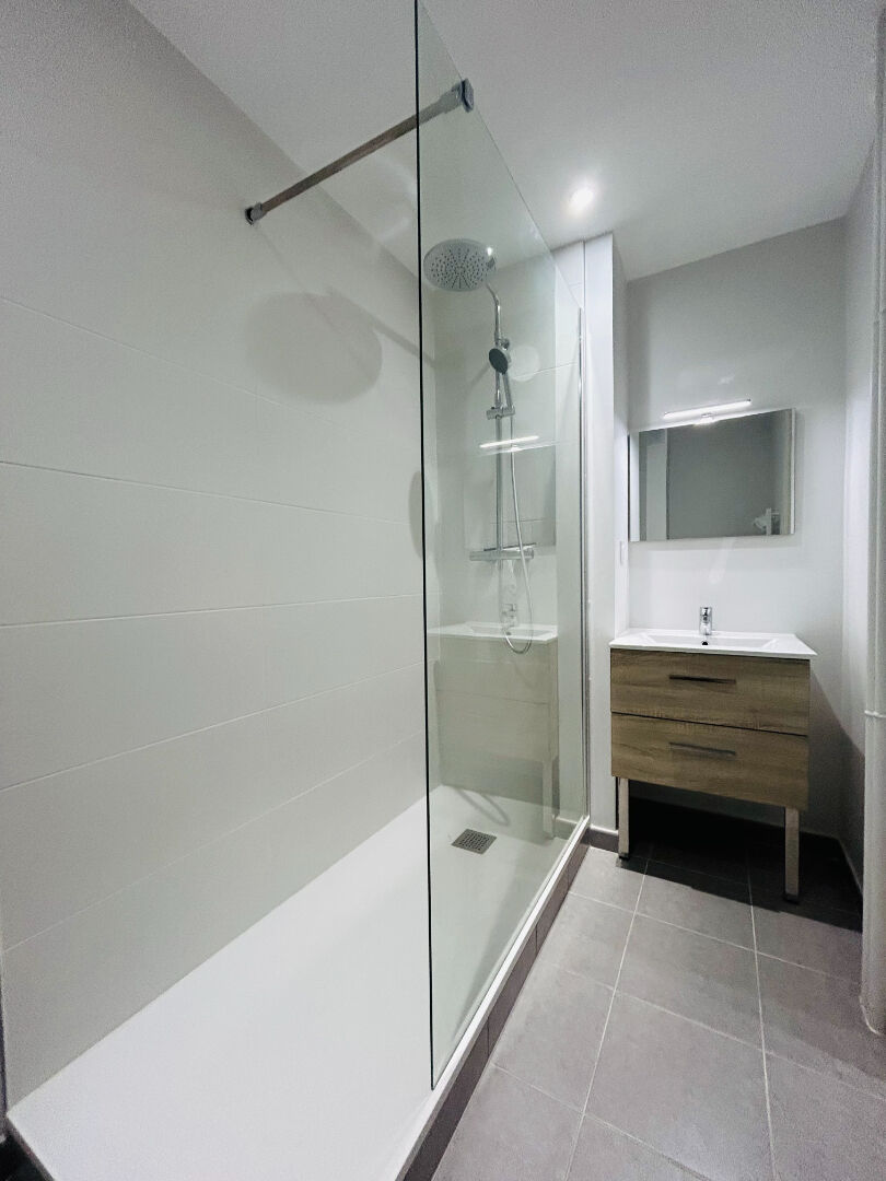 Séjour avec cuisine ouverte équipée (four, micro-ondes, lave-vaisselle, plaques induction, frigo-congélateur, lave-linge), 1 salle d’eau, WC séparé, balcon.