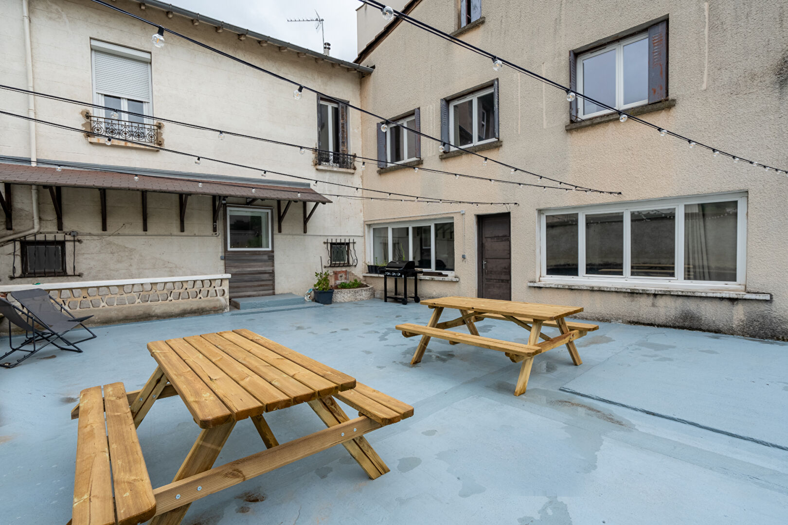 Maison de 221 m² (425 m² surface au sol) composé d’un grand séjour avec TV et barre de son, d’une cuisine équipée, d’un petit salon avec PlayStation, de 7 salles de bain (2 salles de bain commune dont 1 avec baignoire et 5 salles d’eau privées), de 3 WC séparés, d’une salle de sport, de 2 grandes terrasses aménagées, d’un parking 9 places et de 9 chambres spacieuses dont 5 avec salle d’eau privative + un grand garage fermé 9 places (Rare en centre ville)