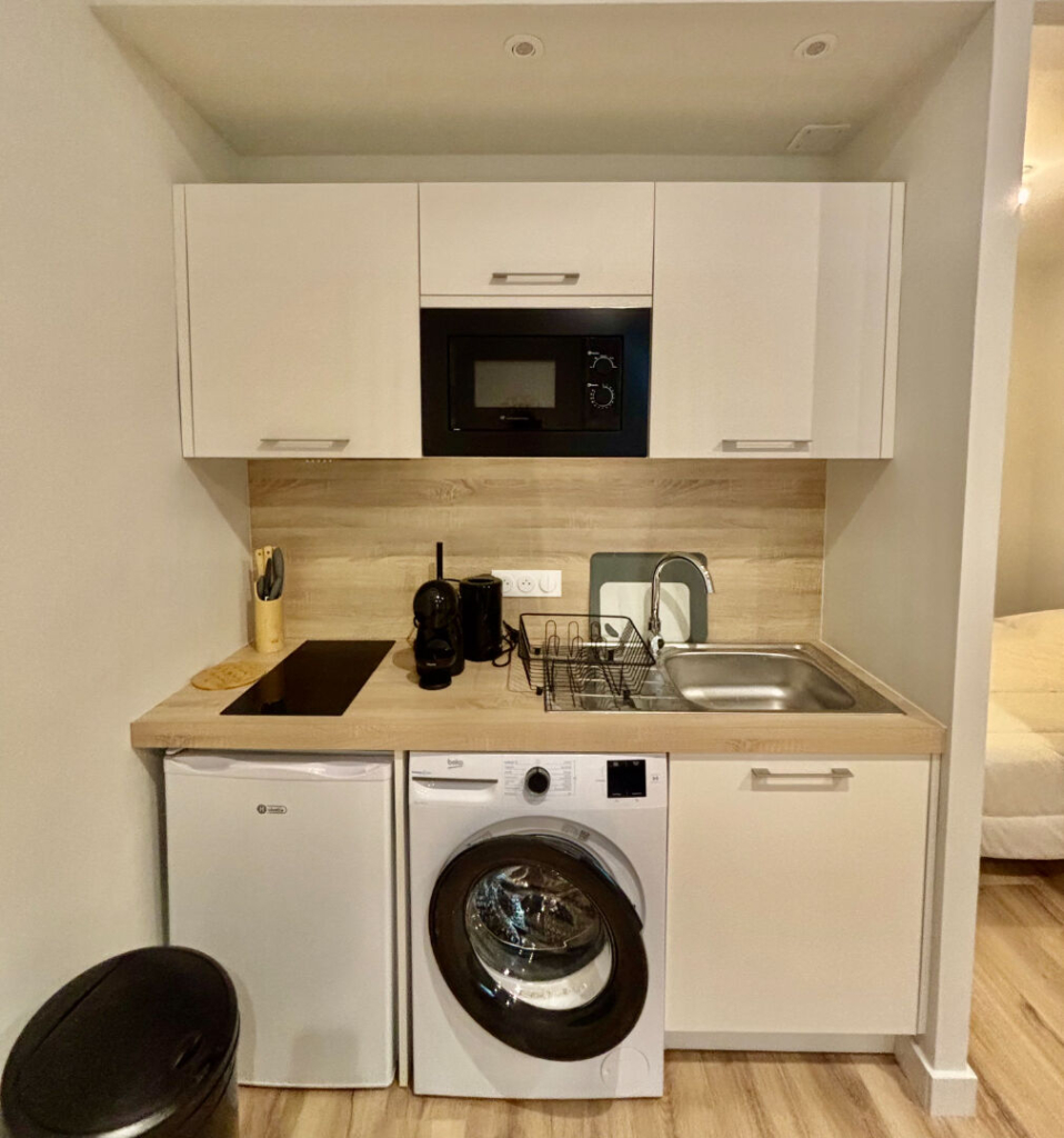 Cuisine ouverte sur la pièce de vie : frigo, micro-ondes, plaque de cuisson, lave-linge
