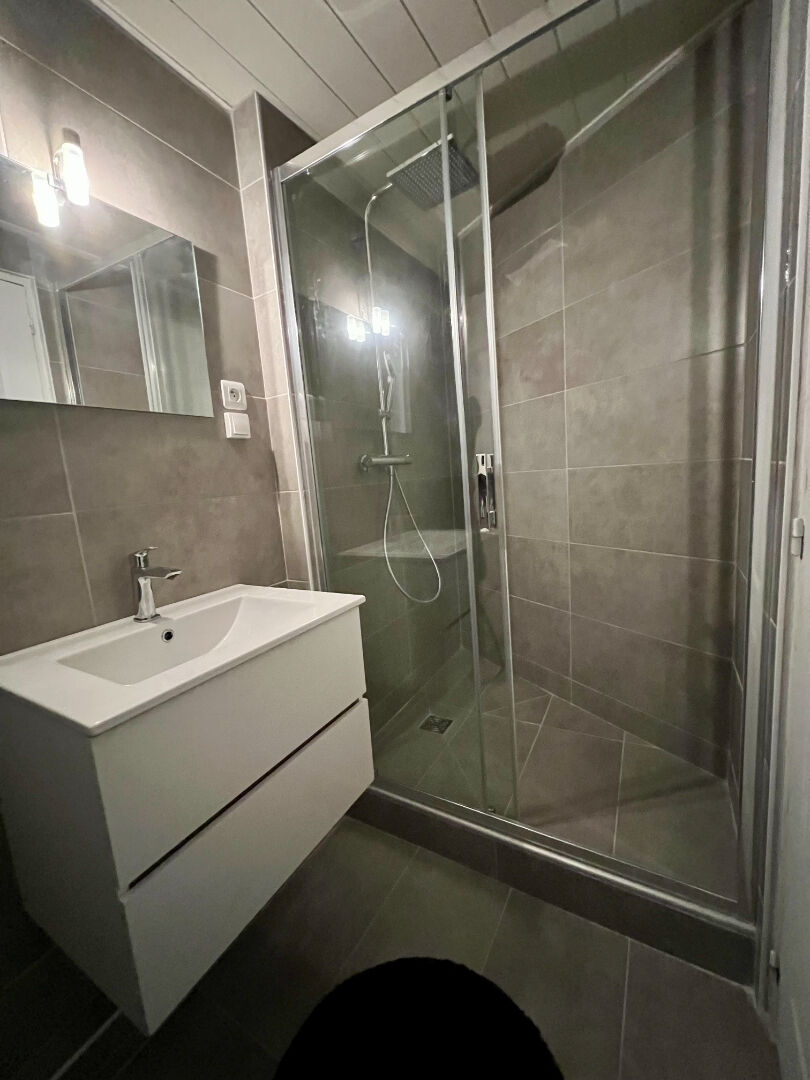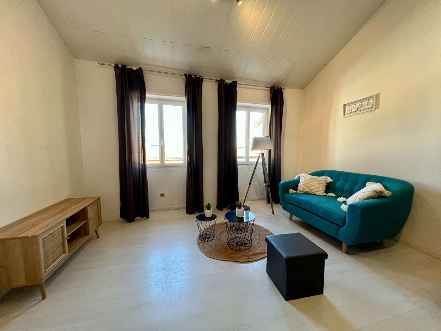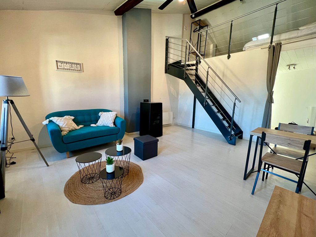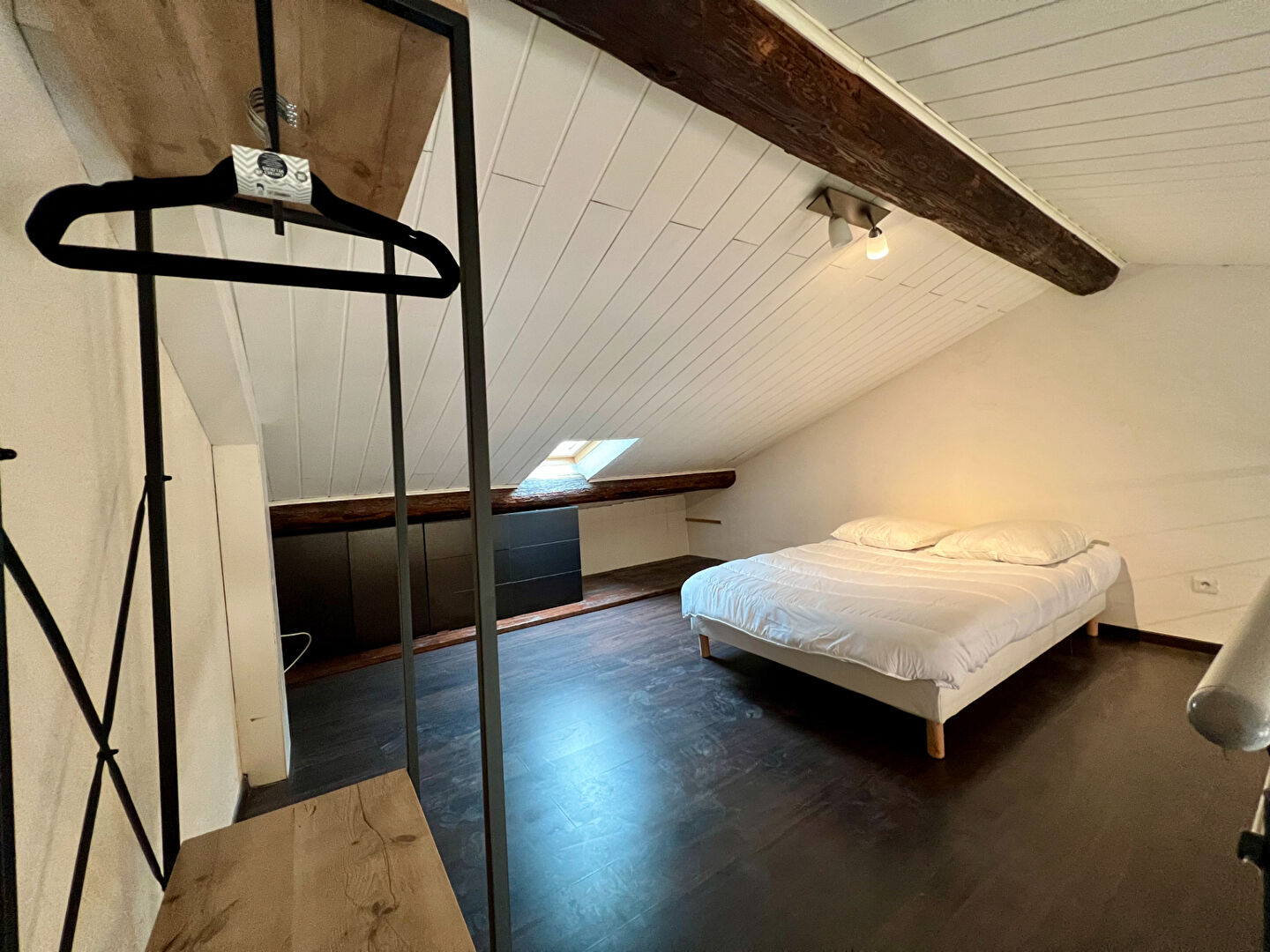 L’appartement est composé d’un grand espace salon, d’une cuisine entièrement équipée et indépendante, d’une chambre en mezzanine avec velux, d’une salle d’eau refaite et de WC séparés.