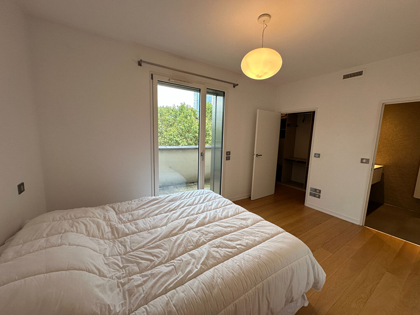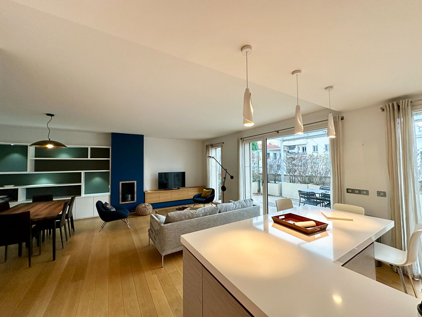 Séjour double lumineux avec grandes baies vitrées donnant un accès direct à la terrasse ? un espace de vie idéal pour recevoir ou se détendre.