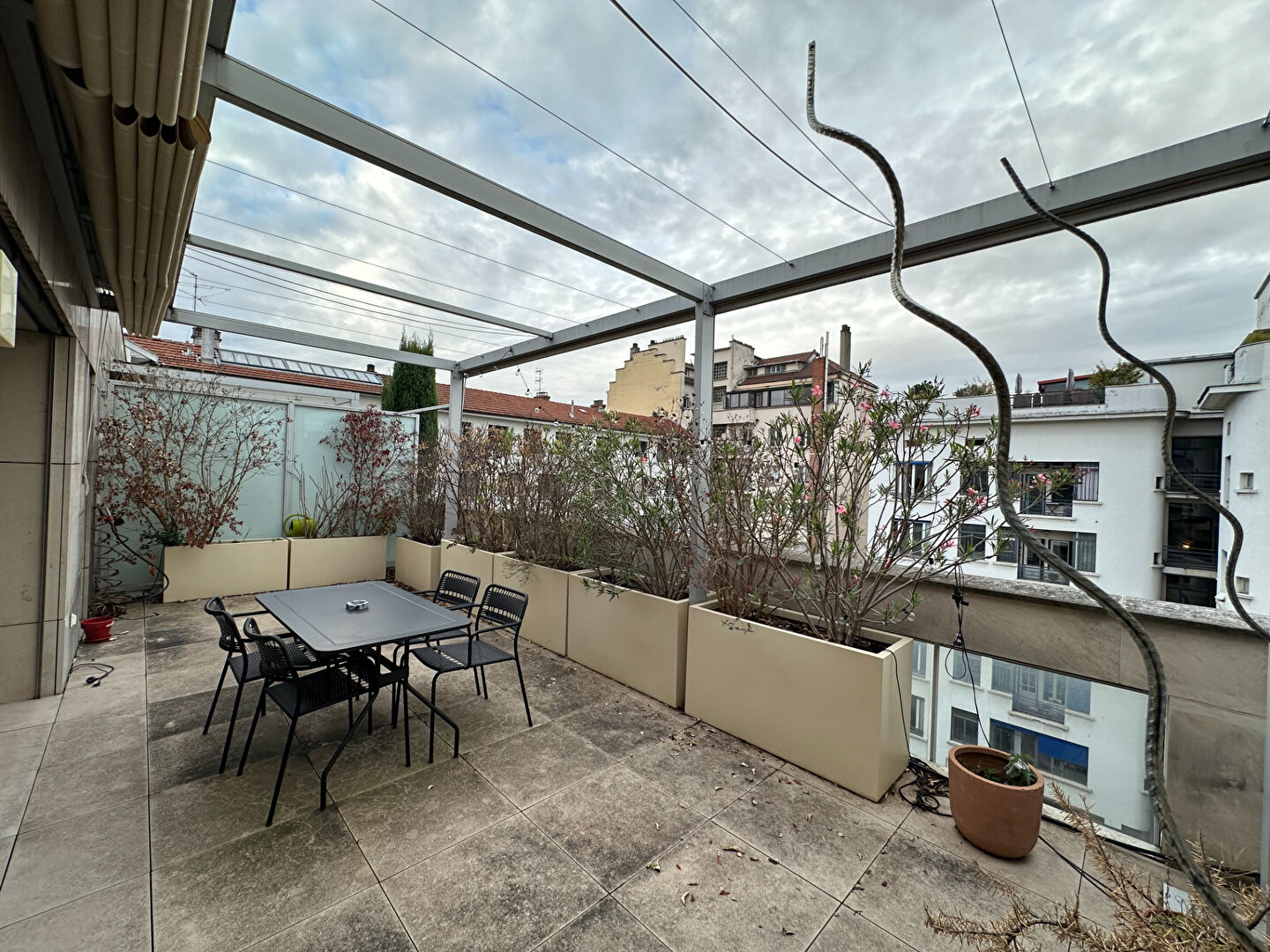 Grande terrasse d’environ 30 m², idéale pour les repas en extérieur, moments de détente ou jardinage urbain.