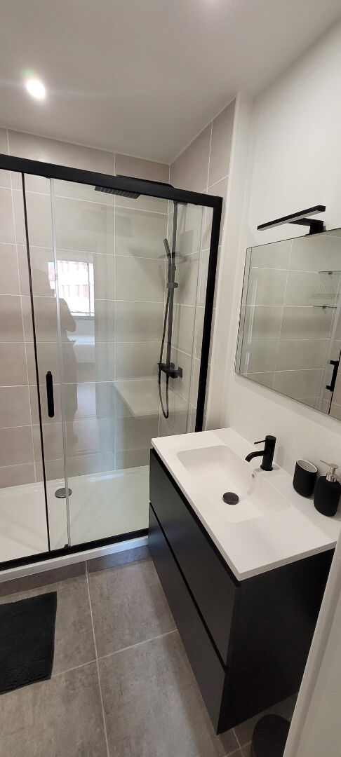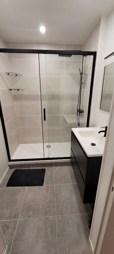 La salle d’eau dispose d’un meuble vasque avec miroir, d’une grande douche ainsi que des rangements.