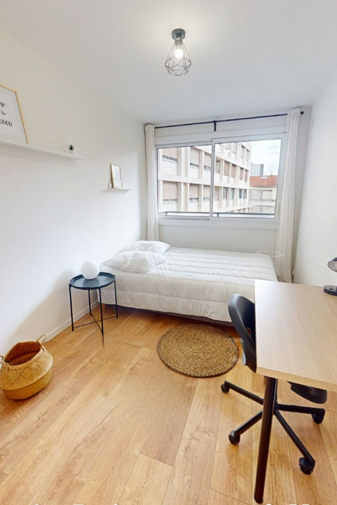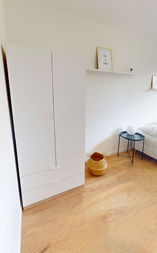 Chaque chambre dispose d’un lit 140, d’une grande armoire et d’un bureau avec chaise.