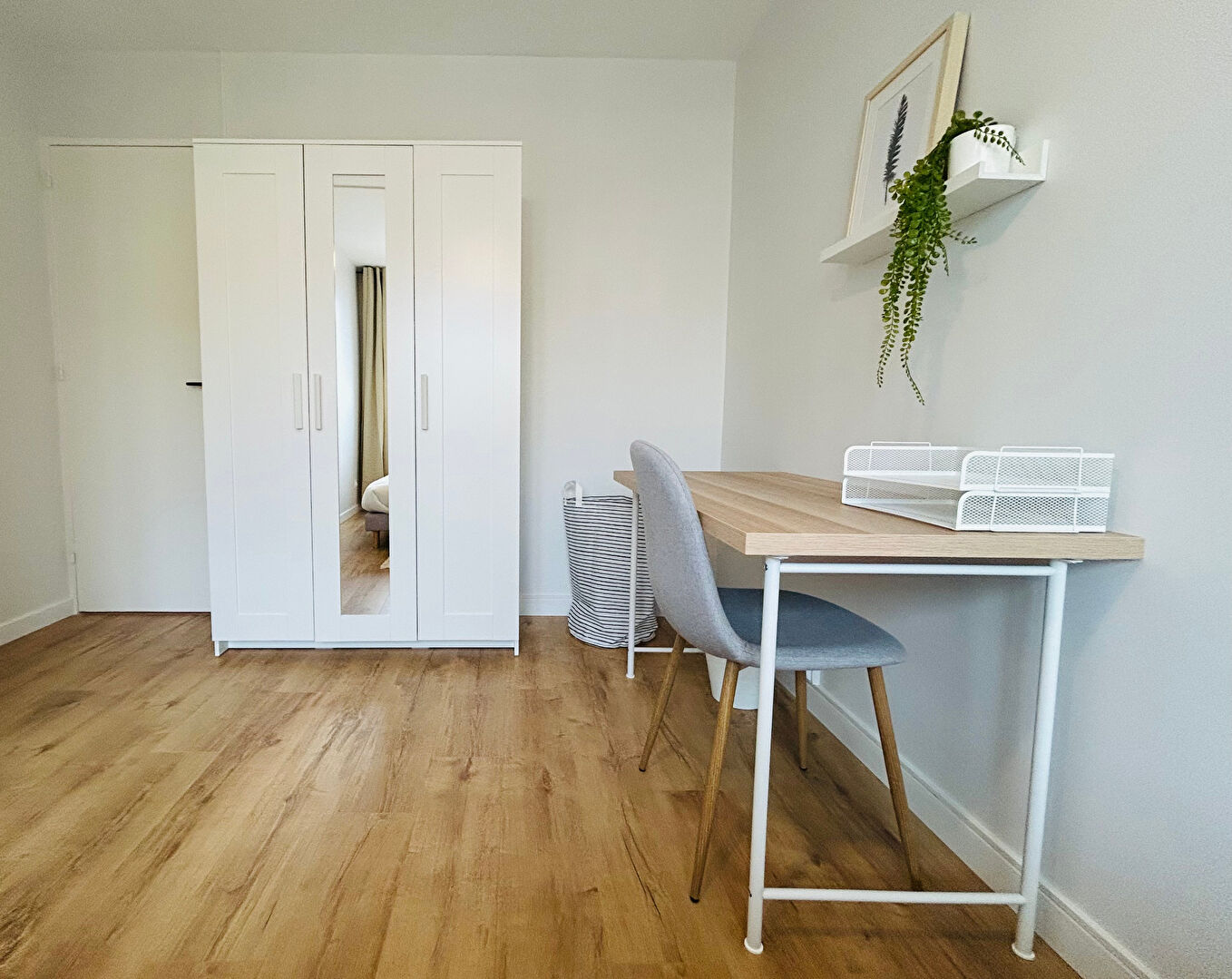 Chaque chambre est entièrement meublée avec lit, bureau, chaise, placard et literie.