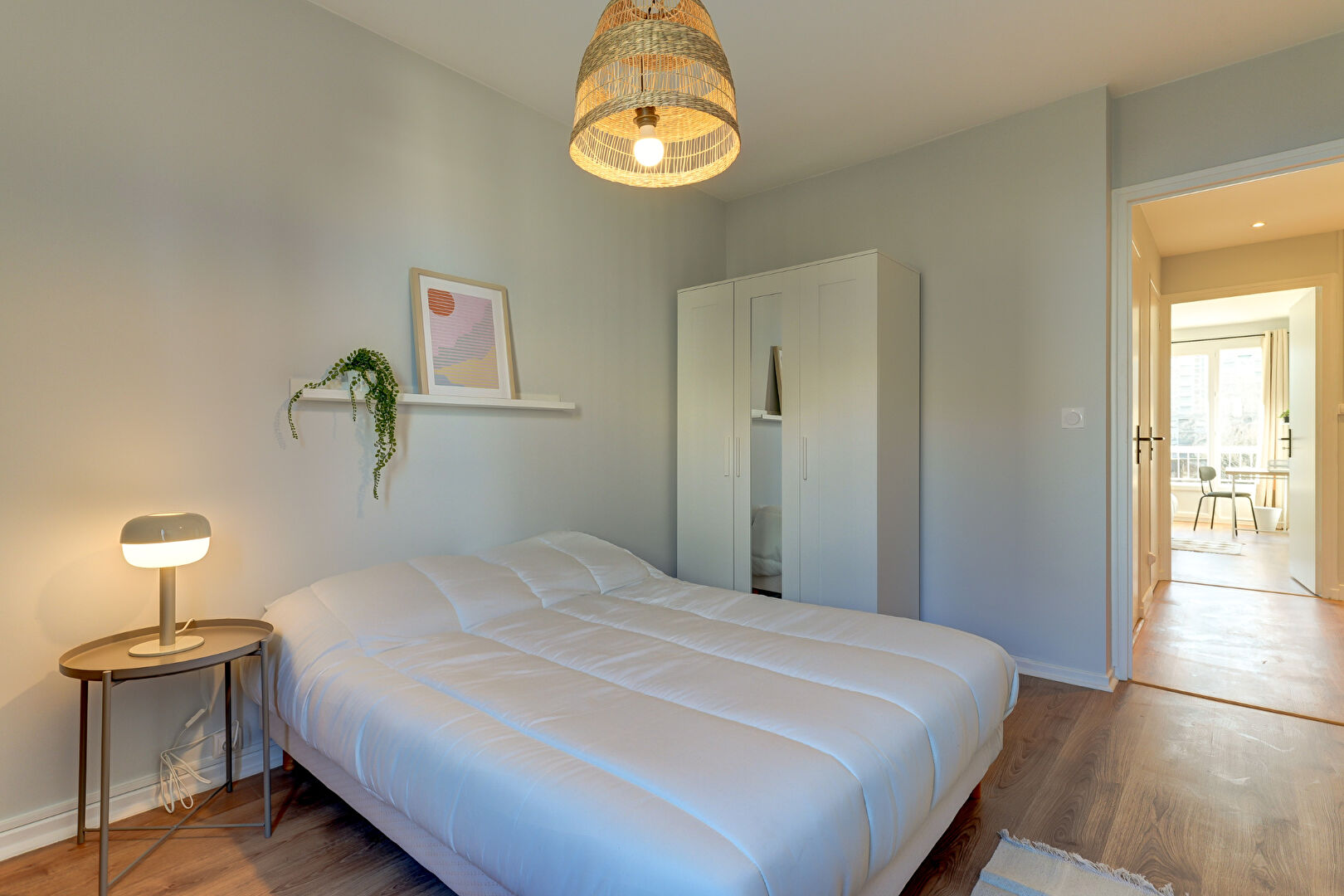 L’appartement est loué entièrement meublé et équipé avec goût tant au niveau des parties communes (frigo-congélateur, lave-vaisselle, plaque de cuisson, lave-linge, batterie de vaisselle complète, etc) que des chambres (lits, bureaux, chaises, placard et literie).