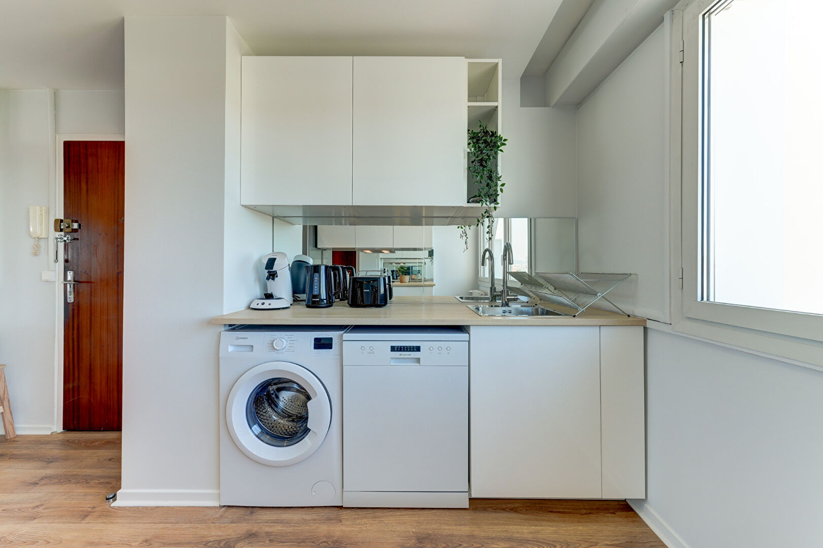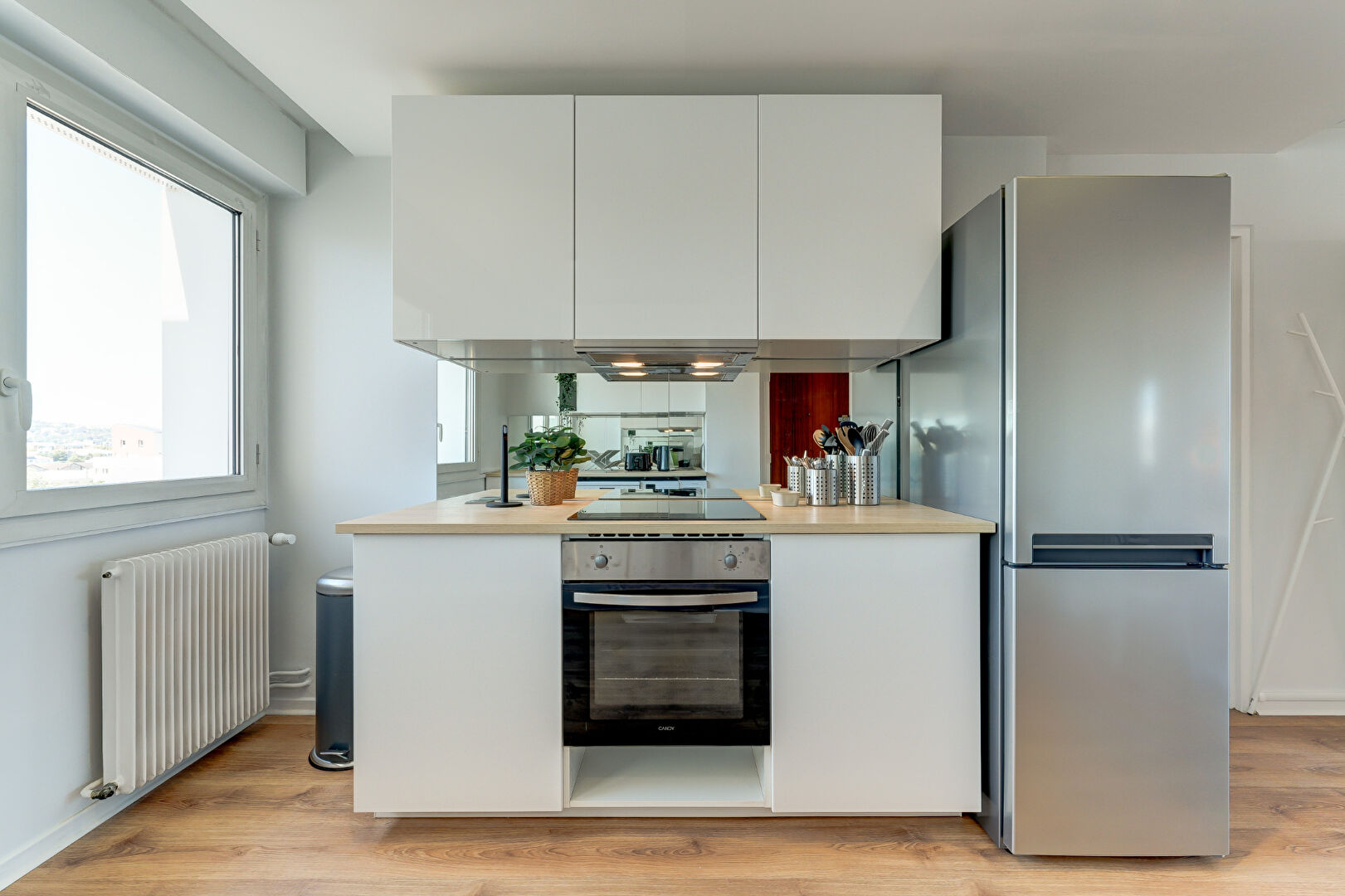 Cuisine ouverte et moderne entièrement équipée : plaques de cuisson, réfrigérateur-congélateur, micro-ondes, lave-vaisselle, ustensiles de cuisine